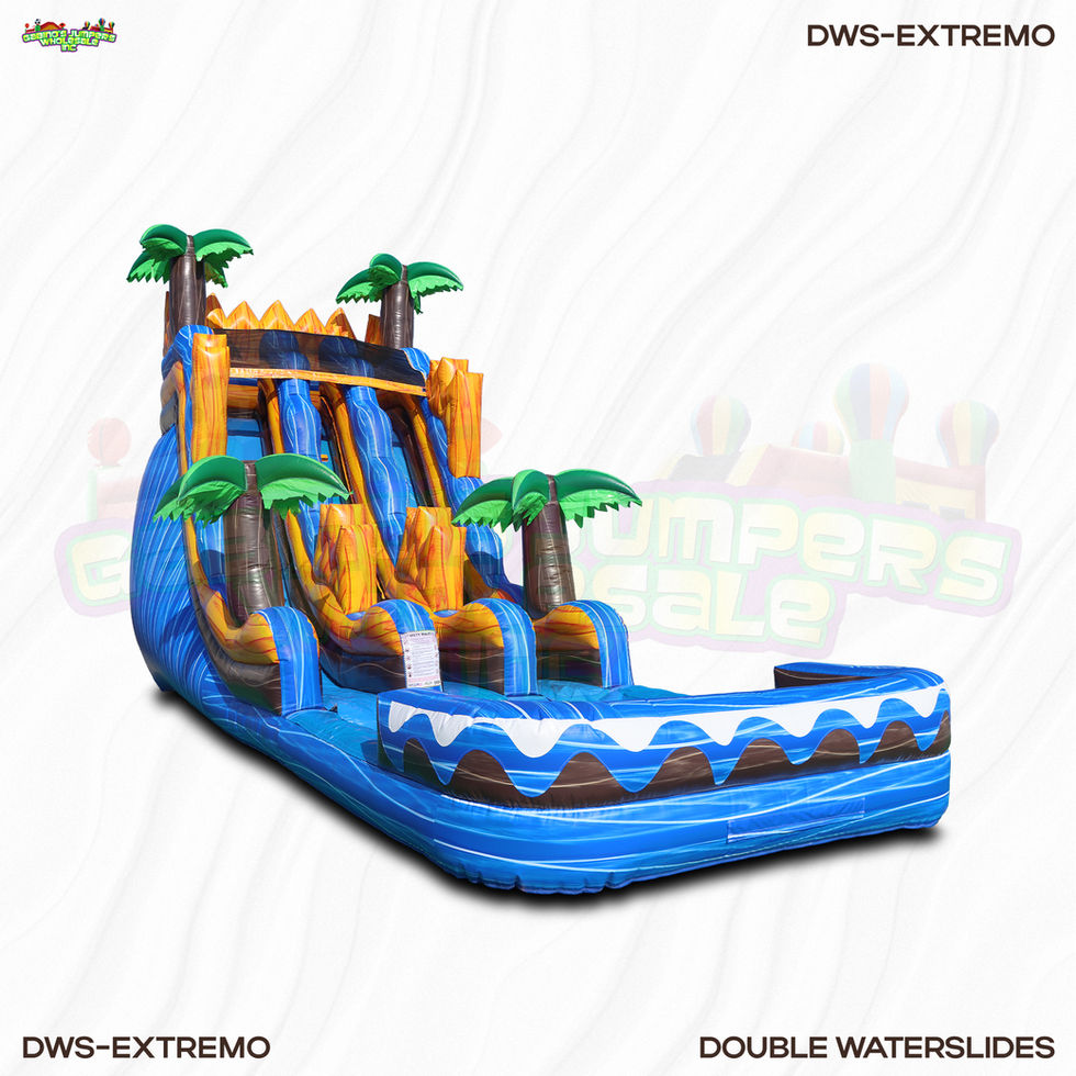 Make a splash like never before with the Extremo Double Waterslide – the tallest waterslide in our lineup! Standing at an impressive 22 feet high, this tropical-themed inflatable is designed for maximum thrills and unforgettable fun. With its bold colors and palm tree accents, Extremo instantly transforms any event into a summer paradise.